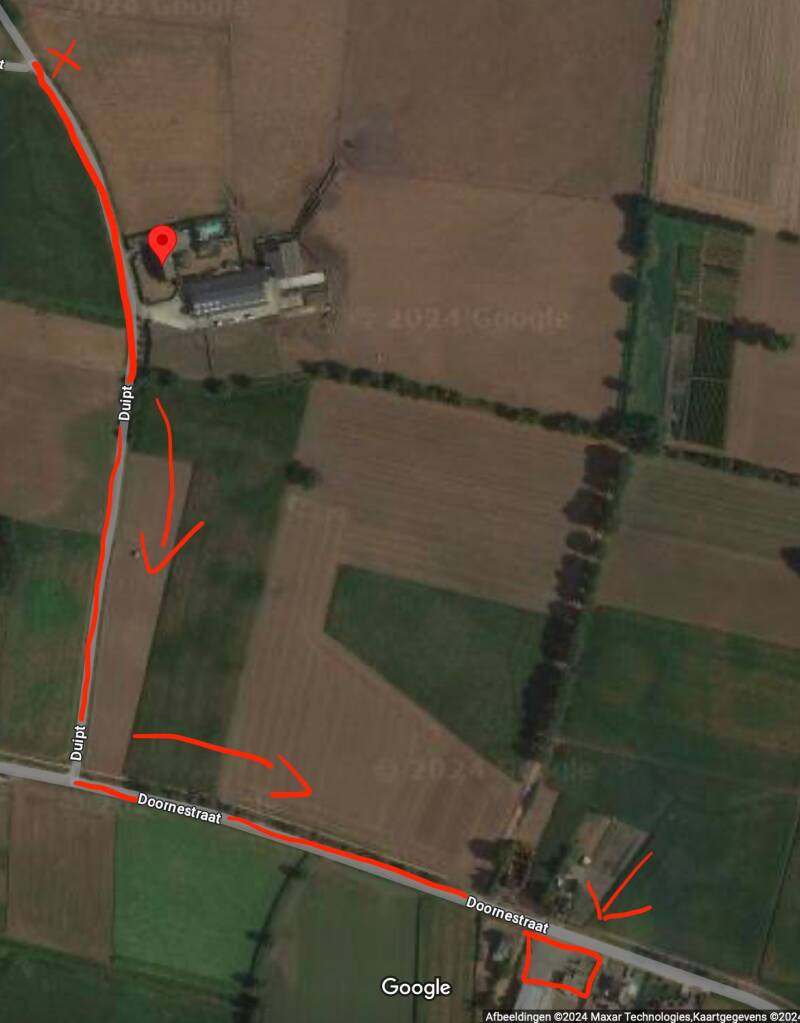 Wij werken in de straat van onze fuif met enkelrichtingsverkeer. Om terug bij onze fuif uit te komen moet je de rode lijn volgen. Van de 'Duipt' naar de 'Doornestraat', dan over 'Heikant'. Dan kom je terug op de 'Duipt' uit, op de 'T' naar links en je komt weer aan de fuif.